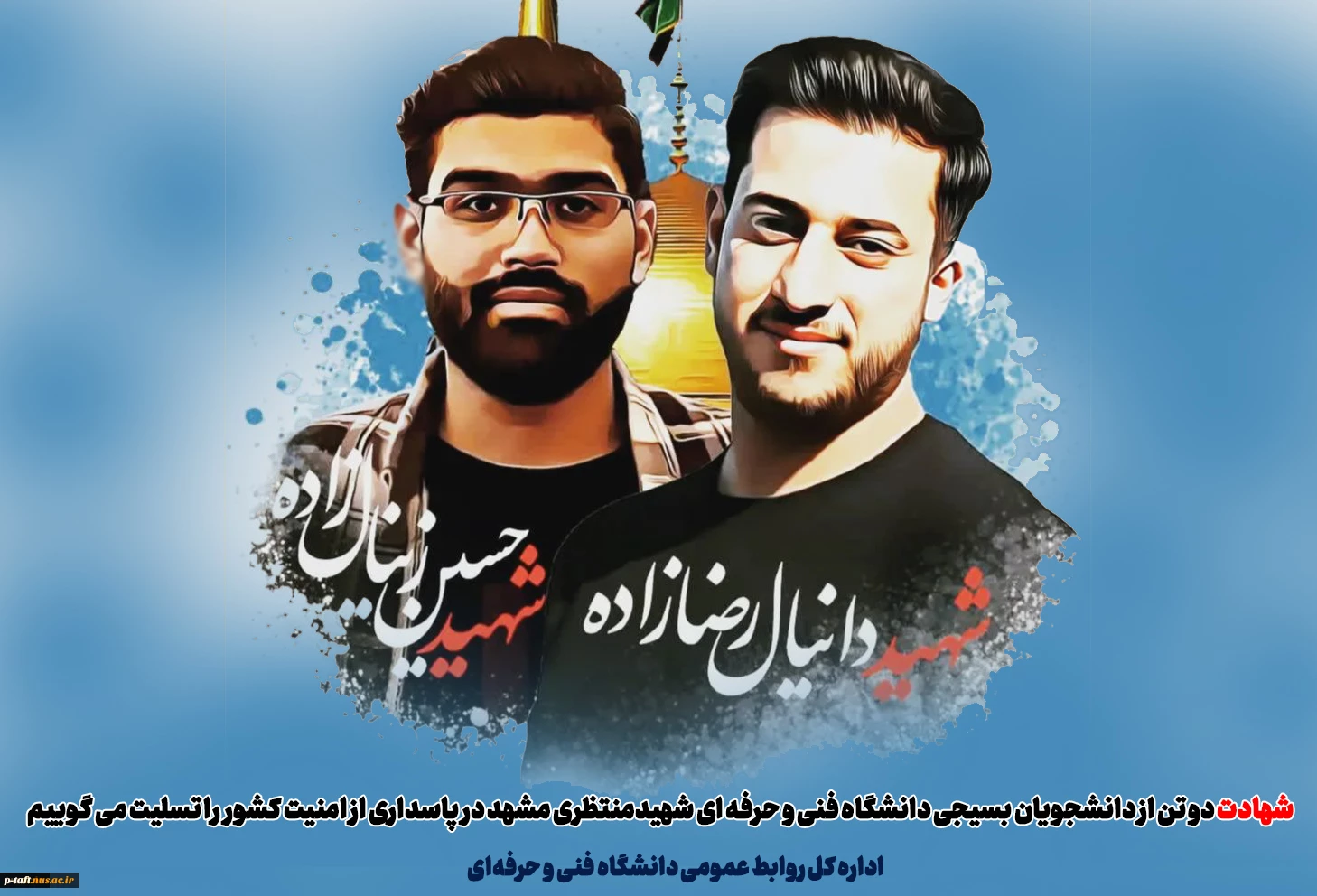 امتیاز دهید : شهادت دو تن از دانشجویان بسیجی دانشگاه فنی و حرفه ای شهیدمنتظری مشهد در پاسداری از امنیت کشور را تسلیت می گوییم. 2 شنبه 28 آبان 1401 ساعت 11:09