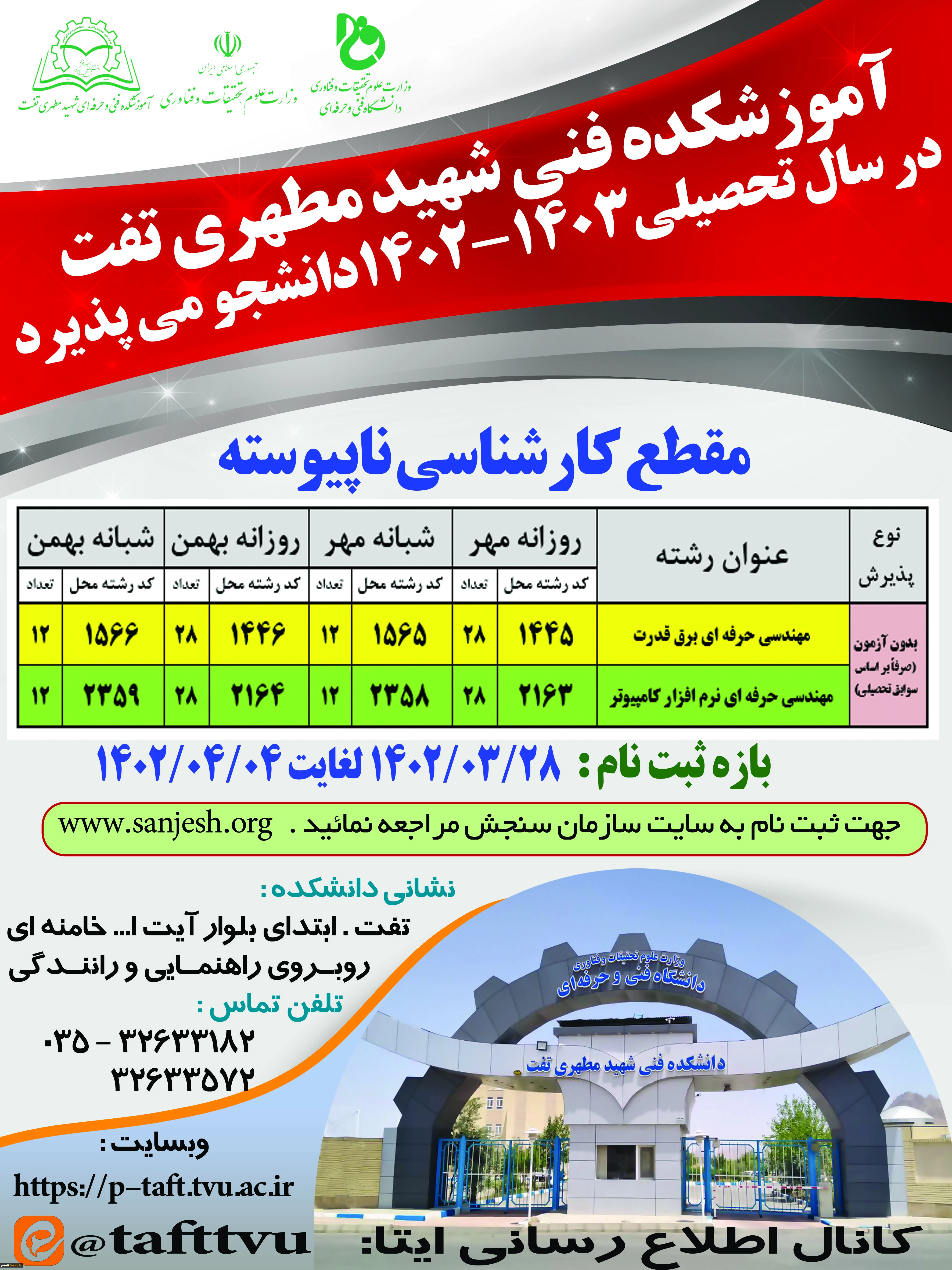 امتیاز دهید : تحصیل رایگان مقطع کارشناسی در آموزشکده فنی شهید مطهری تفت 2 دوشنبه 29 خرداد 1402 ساعت 17:49